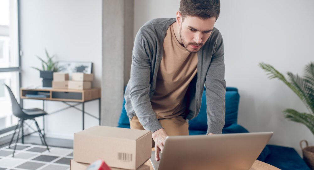 Calm focused young Internet shop worker standing at the office table and typing on his laptop
